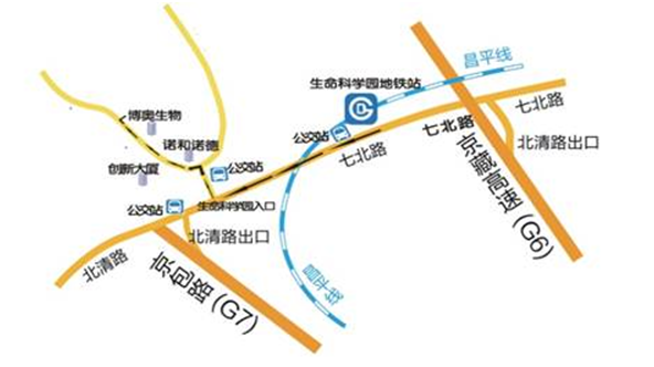 5、 地铁昌平线生命科学园站A1出,在地铁生命科学园地铁站公交站乘坐871路到达生命园西环路站下车,往回走50米即到博奥生物。