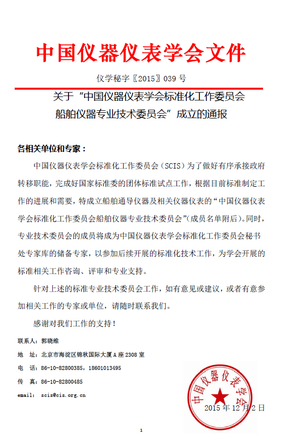中国仪器仪表学会标准化工作委员会(SCIS)为了做好有序承接政府转移职能,完成好国家标准委的团体标准试点工作,根据目前标准制定工作的进展和需要,特成立船舶通导仪器及相关仪器仪表的“中国仪器仪表学会标准化工作委员会船舶仪器专业技术委员会”(成员名单附后)。