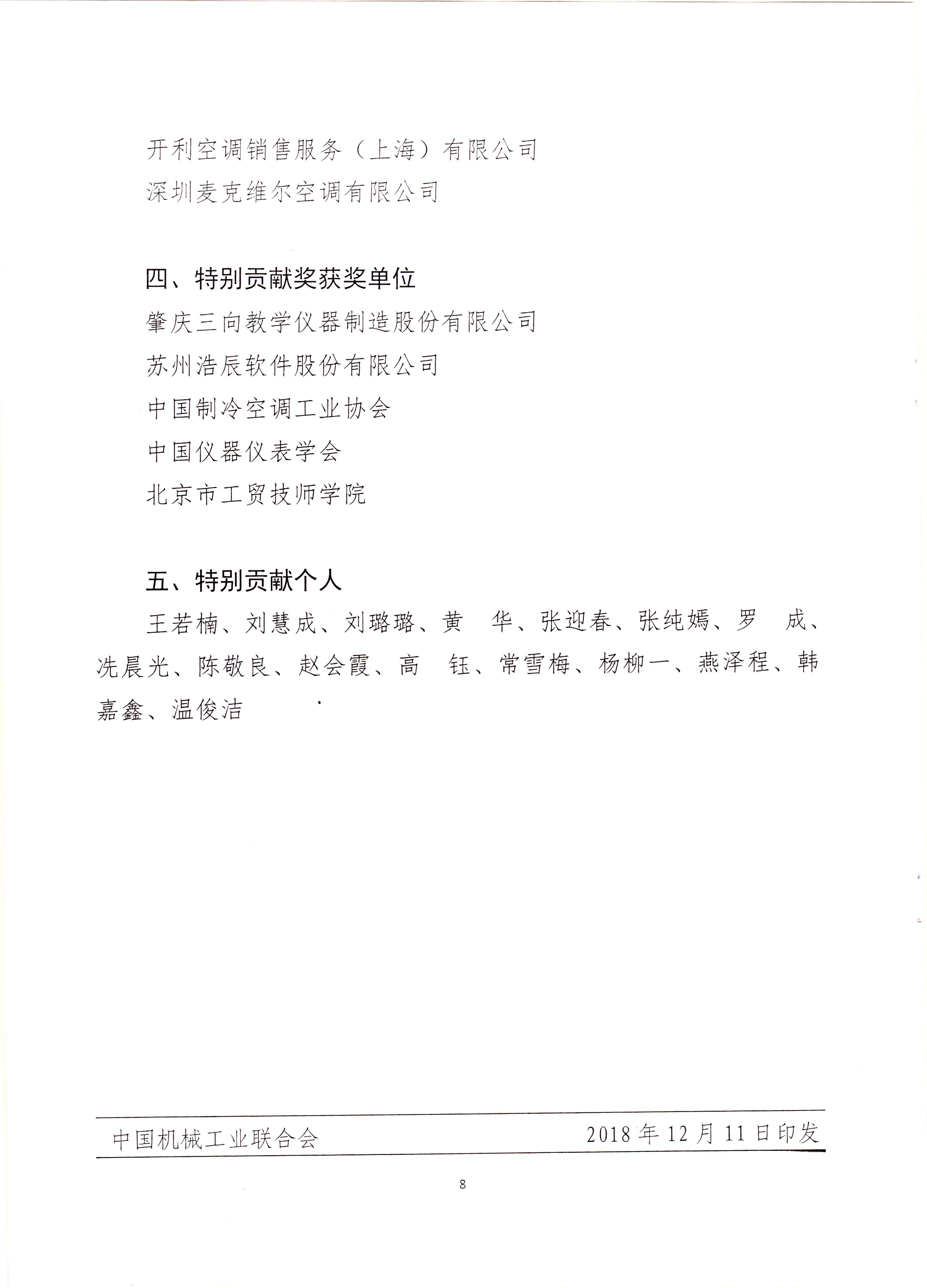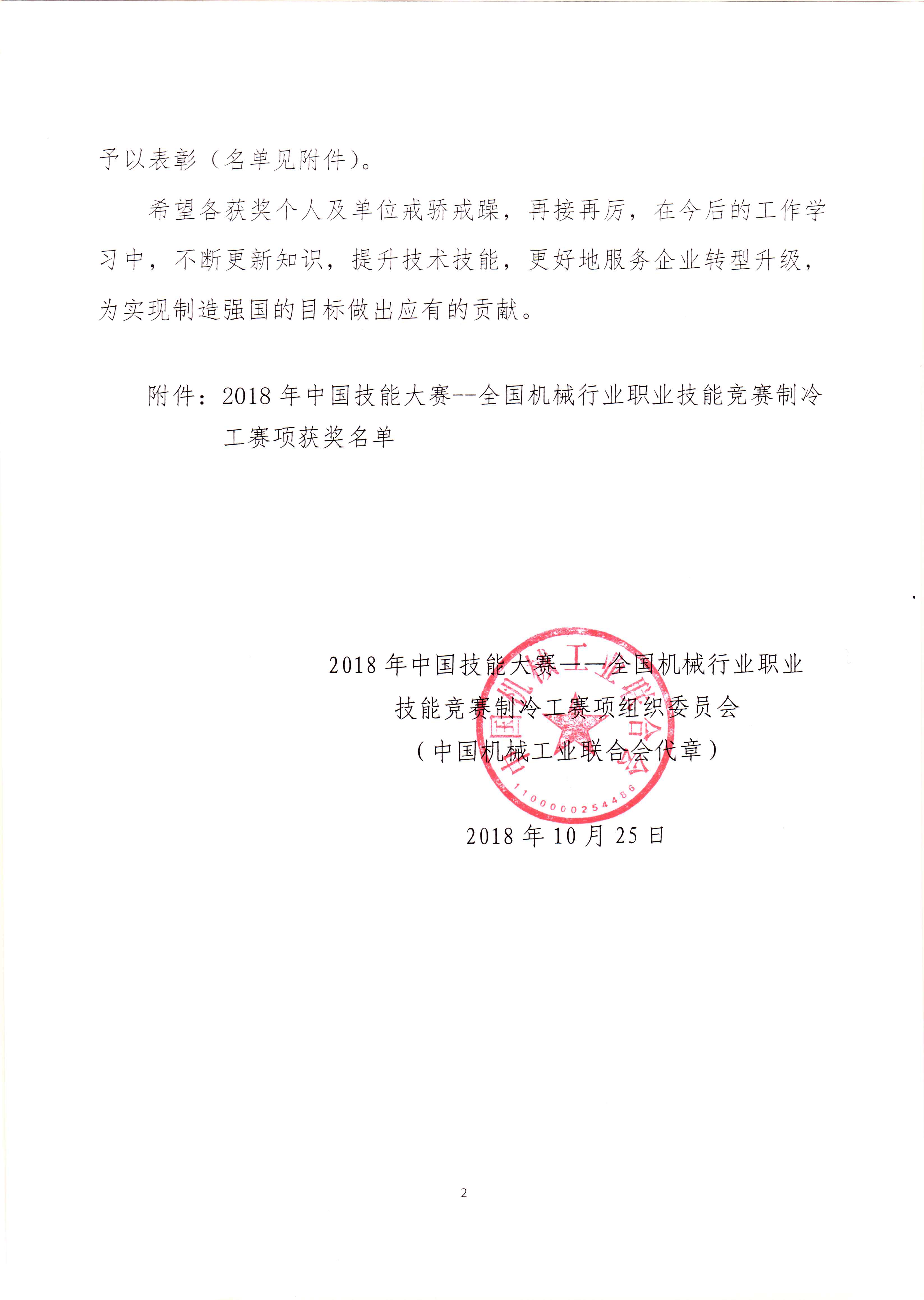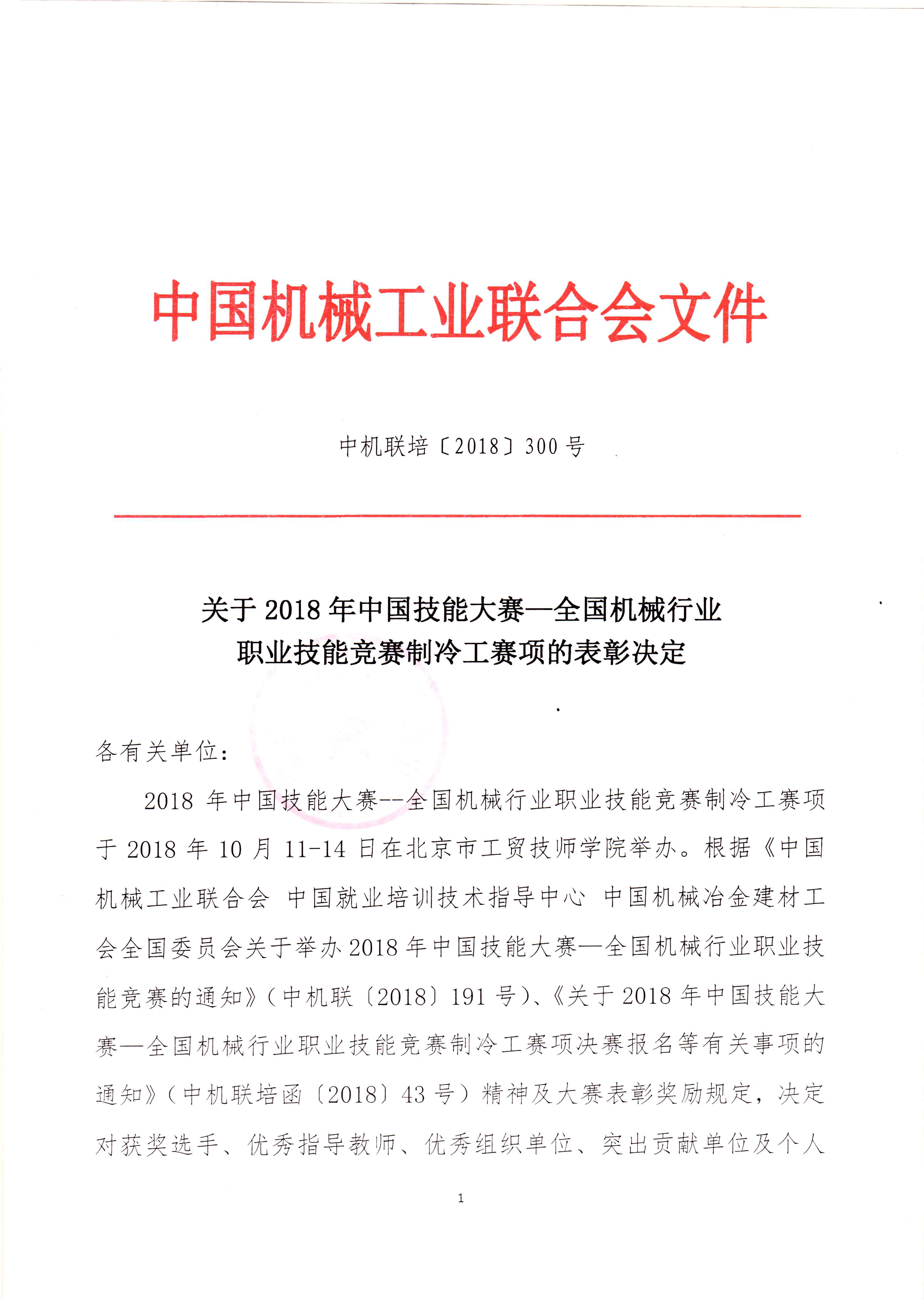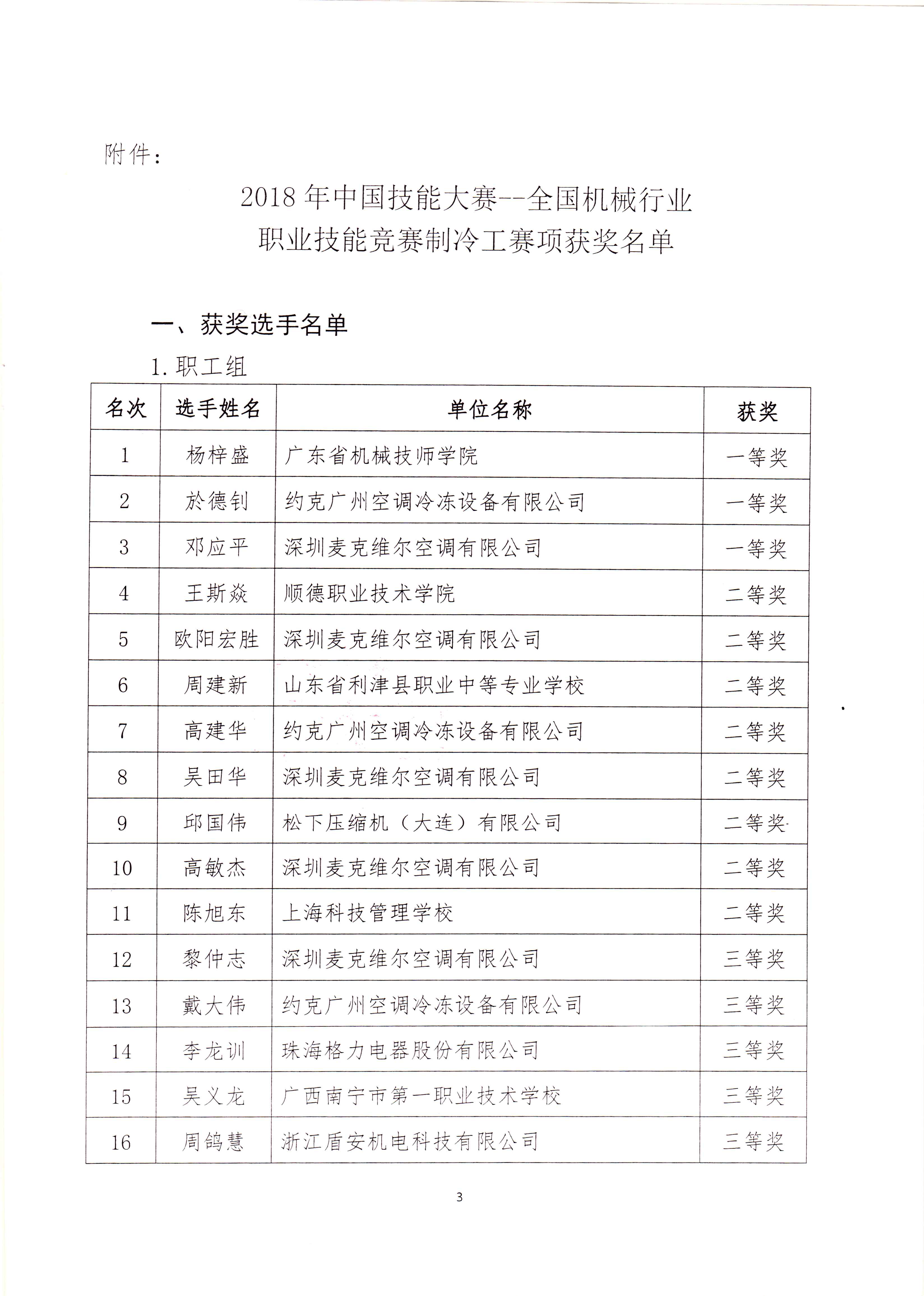 关于2018年中国技能大赛——全国机械行业职业技能竞赛制冷工赛项的表彰决定