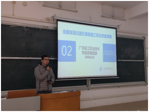 2017年2月26日日下午,全国首届仪器仪表制造职业技能竞赛(华南分赛区)初赛第三考场(来自广东轻工职业技术学院、广州市交通技师学院的47名职校学生)考试在广东轻工职业技术学院南海校区举行,广州市仪器仪表学会张健民秘书长,广州市交通技师学院机电系郭军平主任,广东轻工职业技术学院主管全校技能竞赛的学生发展中心祁鸣鸣主任、信息技术学院罗志聪副院长、团委李康泉书记等领导亲临考场指导工作,祁鸣鸣主任还代表广东轻工职业技术学院致辞。