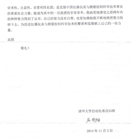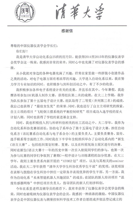 为鼓励高等院校在校学生勤奋学习,刻苦钻研、勇于开拓、大胆创新,为发展我国仪器仪表及测量控制事业培养创新型人才,中国仪器仪表学会设立仪器仪表奖学金。近日,中国仪器仪表学会收到2013-2014年度中国仪器仪表学会奖学金获奖者清华大学自动化系厉丹阳同学的感谢信,详细内容如下: